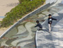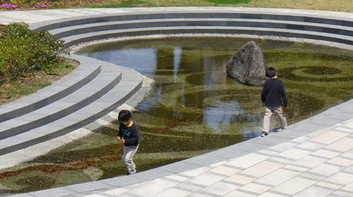 平中央公園は、平中央公園を中心に音楽館、文化センター、市役所、美術館などが位置する文化交流ゾーンに計画されたいわき市文化交流施設整備の一環です。 穏やかな芝生の丘を中心に、緩やかに流れる水景施設と既存樹木を活かした緑豊かな散策スペースです。散策路は立体的に文化交流施設へアプローチしています。建築施設の周辺舗装は、建築と融合したマテリアルを生かした空間をつくります。